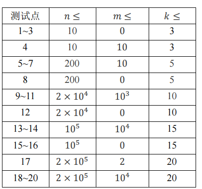 【数据范围】对于所有测试数据有:$2≤n≤2×10^5,0≤m≤(min(n,10^4),2≤k≤20,1≤d_i≤n,d_i≠i,1≤c_i≤k $。保证不会有重复确认同一个帮派的旗帜种类。