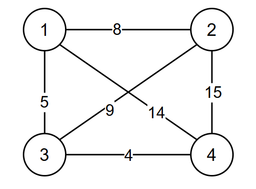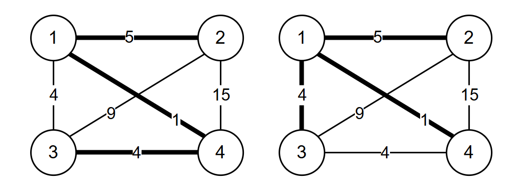 对于第二条边u=2,v=4,w=15来说,权值改为4后,不论我们怎么修改一条边的权值,都是最小生成树的边。如果我们把权值改为5,如果变化u=1,v=2,w=8的边的权值为1,此时最小生成树有不同的两种,不能保证这条边,一定在最小生成树中。