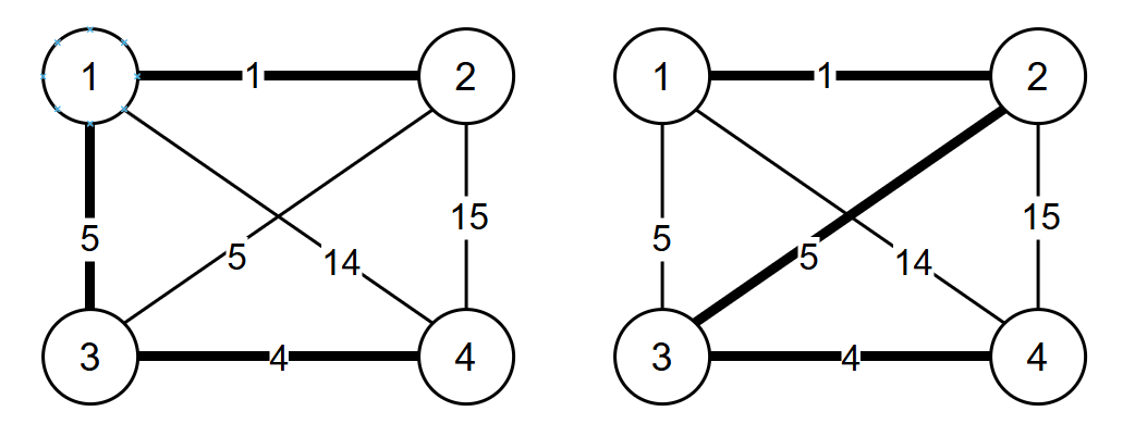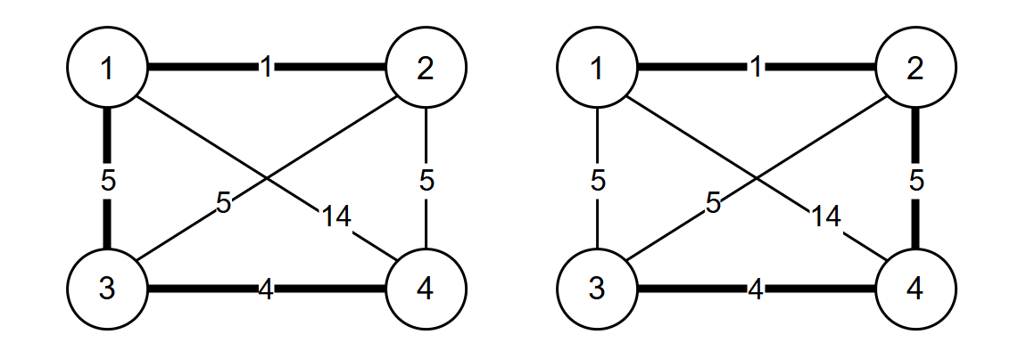 对于第4条边u=1,v=3,w=5来说,权值改为3后,不论我们怎么修改一条边的权值,都是最小生成树的边。如果我们把权值改为4,如果变化u=1,v=4,w=14的边的权值为1,此时最小生成树有不同的两种,不能保证这条边一定在最小生成树中。