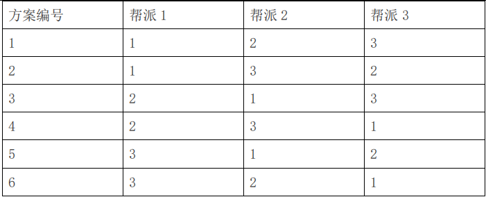 一共有3个帮派,旗帜种类一共有3种,1号帮派的敌对帮派是2号帮派,2号帮派的敌对帮派是3号帮派,3号帮派的敌对帮派是1号,没有已经确定旗帜种类的帮派。有6种方案满足条件。