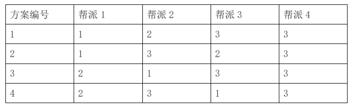 一共有4个帮派,旗帜种类一共有3种,1号帮派的敌对帮派是3号帮派,2号帮派的敌对帮派是1号帮派,3号帮派的敌对帮派是2号,4号帮派的敌对帮派是1号,另外已经确定了4号帮派的旗帜是第3种。一共有4种方案满足条件。