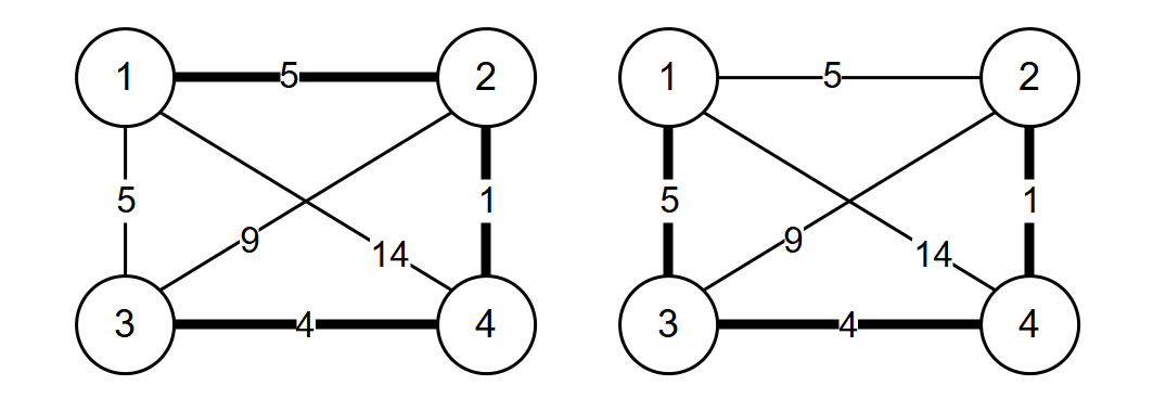 对于第4条边u=1,v=3,w=5来说,权值改为3后,不论我们怎么修改一条边的权值,都是最小生成树的边。如果我们把权值改为4,如果变化u=1,v=4,w=14的边的权值为1,此时最小生成树有不同的两种,不能保证这条边一定在最小生成树中。
