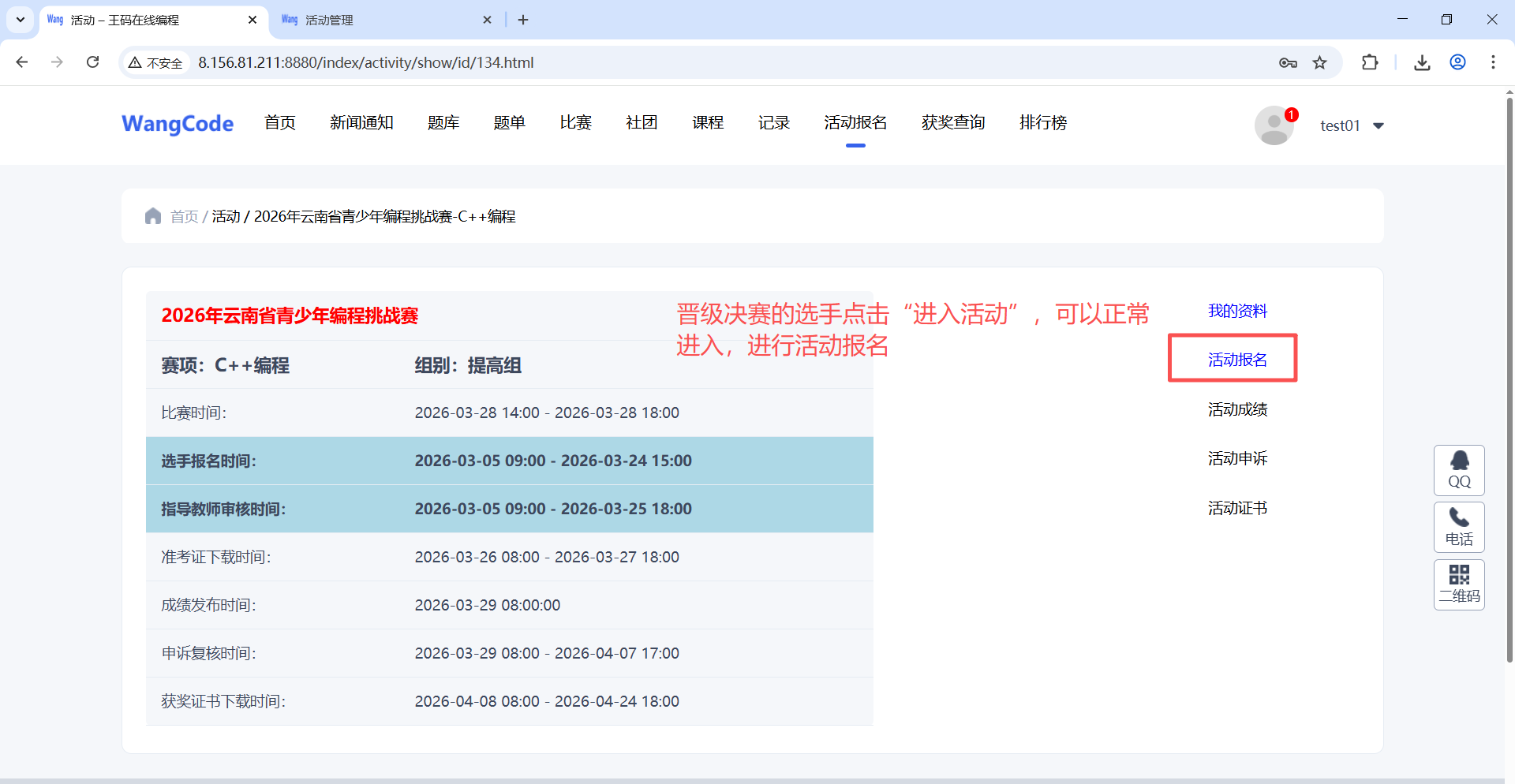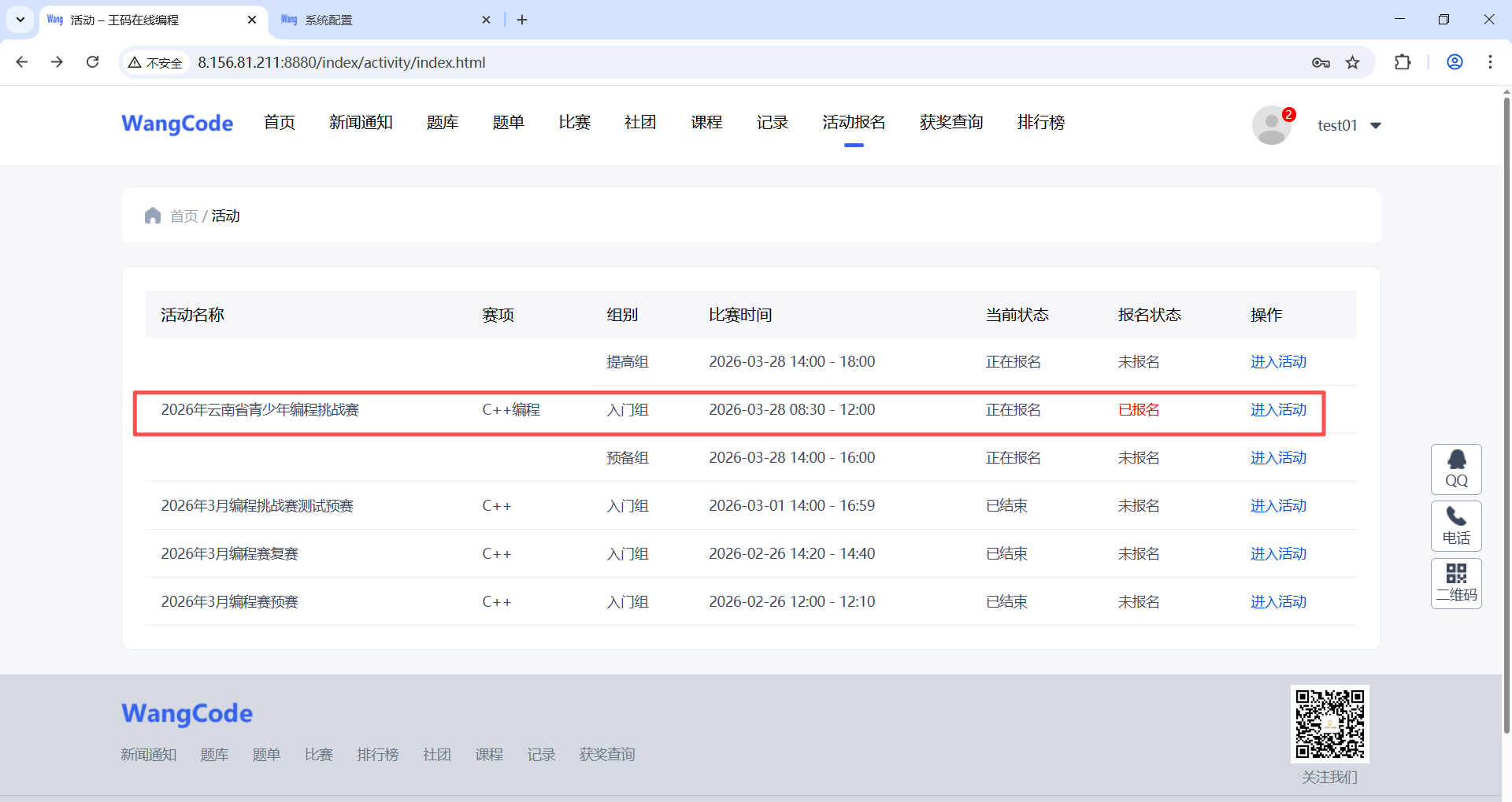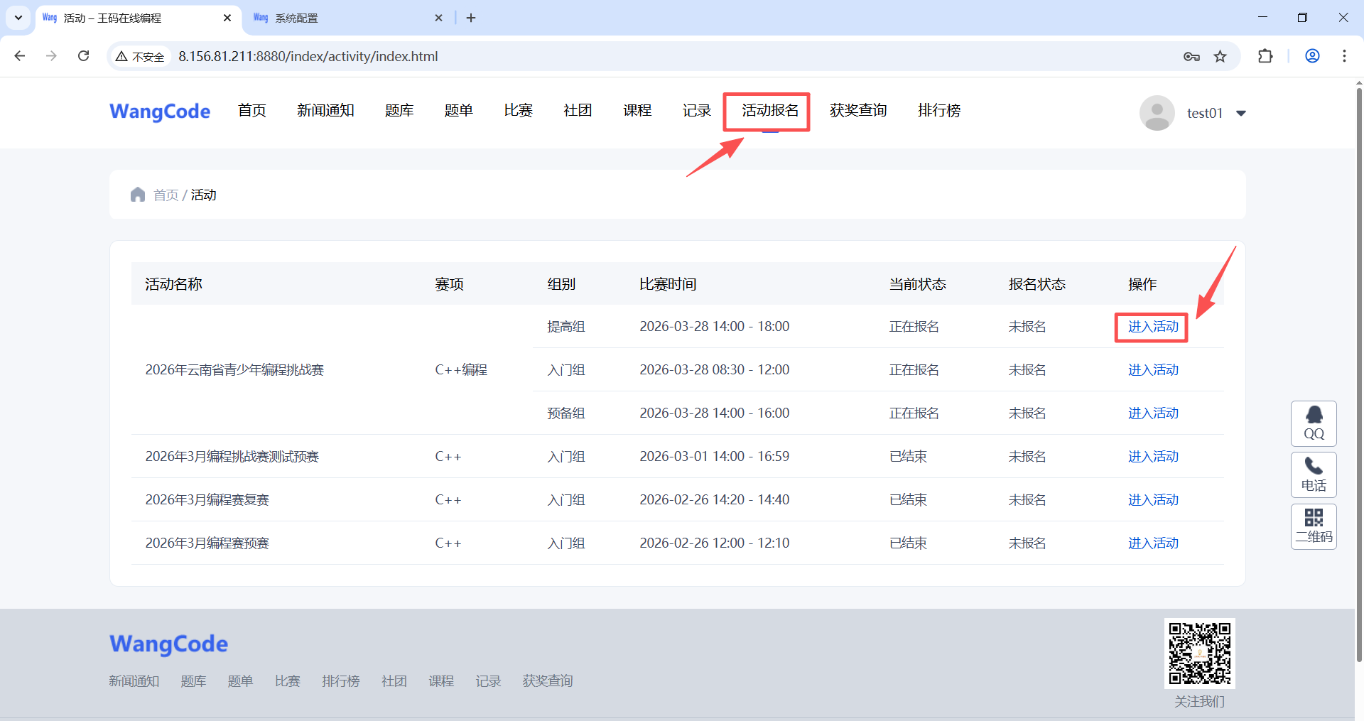 (1)注册成功后点击“活动报名”按钮,进入比赛列表页面,根据要报名的比赛、赛项和组别,点击后面的“进入活动”按钮,这里以“2026年云南省青少年编程挑战赛-C++赛项-预备组”来进行演示。