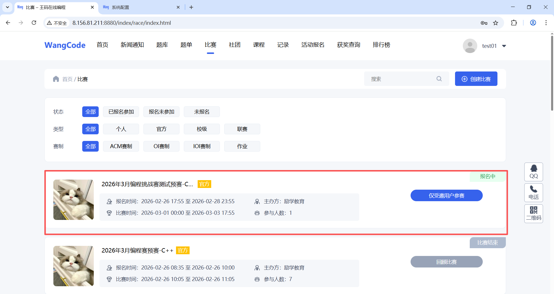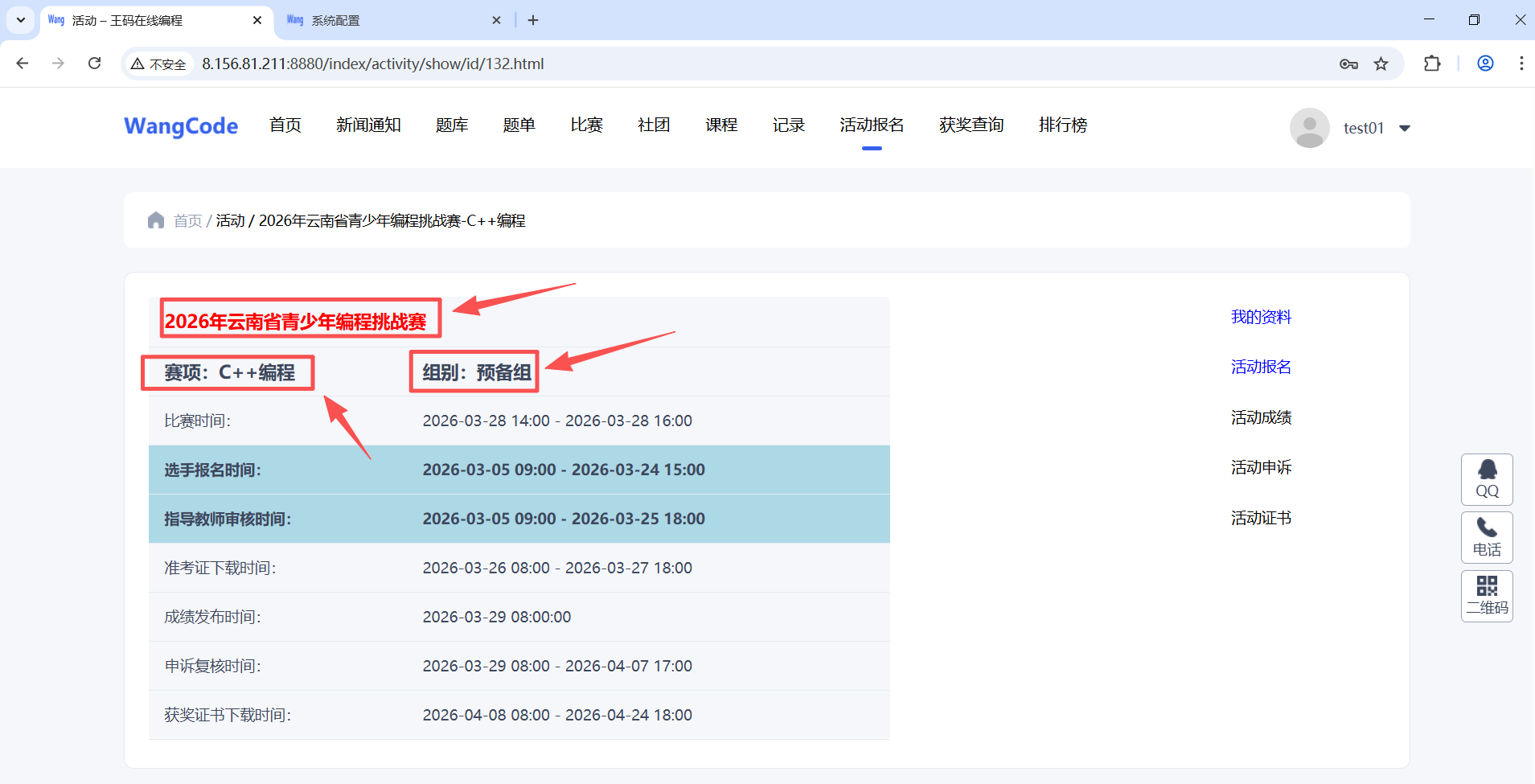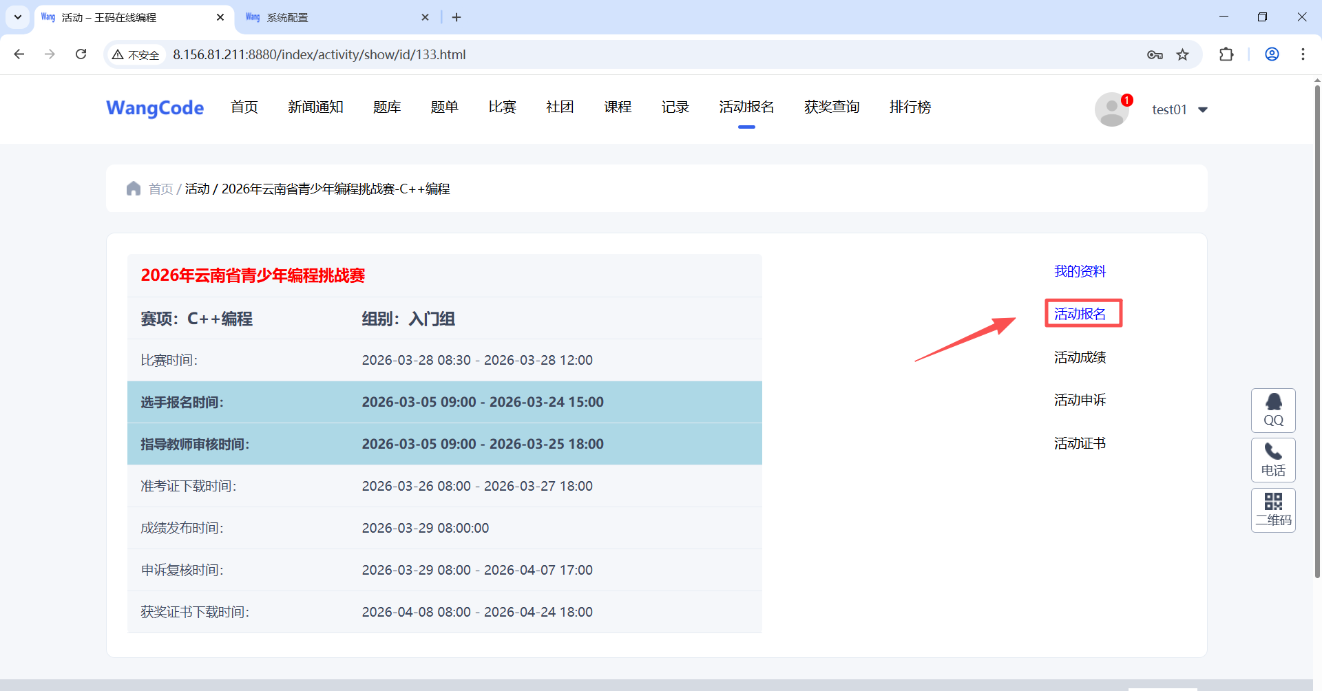 (1)注册成功后点击“活动报名”按钮,进入比赛列表页面,根据要报名的比赛、赛项和组别,点击后面的“进入活动”按钮,这里以“2026年云南省青少年编程挑战赛-C++赛项-预备组”来进行演示。