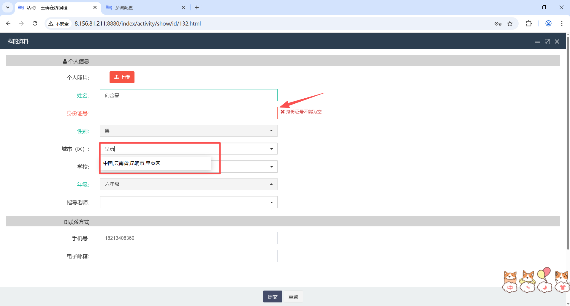 ② 填写城市(区)时可以直接输入选手所在学校区域,例如:昆明市第十中学输入盘龙、昆三中输入呈贡,系统会自动弹出符合输入的选项(若系统没有自动弹出选项,删除后重新输入即可)。