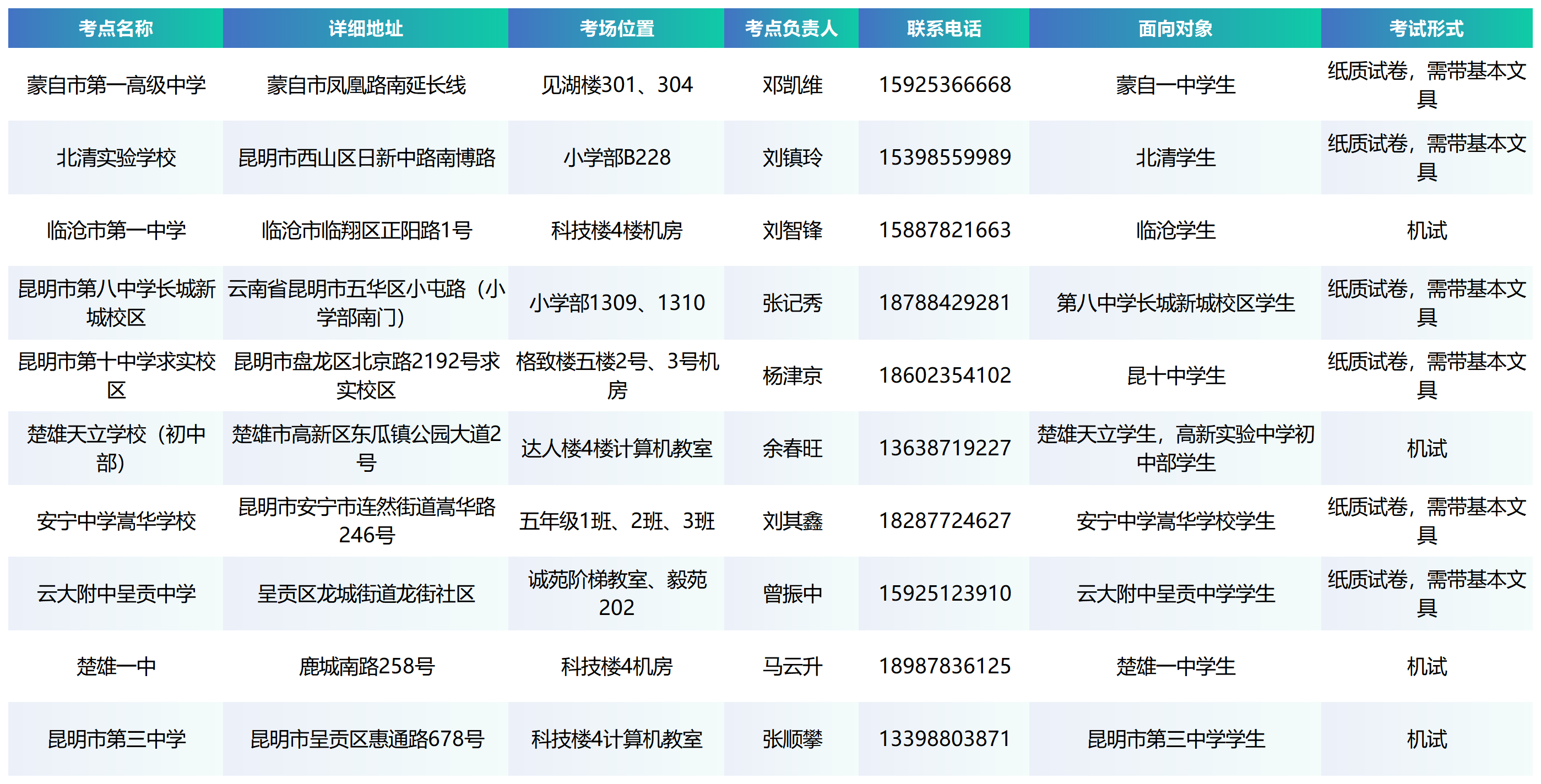 2026年第五届云南省青少年编程挑战赛线下考试即将举行。为方便选手提前做好考试准备,现将各线下考点名单、详细地址及考点负责人联系方式公布如下。考点分为两类:校内考点(主要面向本校学生)和校外机构考点(面向社会考生)。请各位选手根据自身情况选择就近考点,并提前与考点负责人确认考试安排。