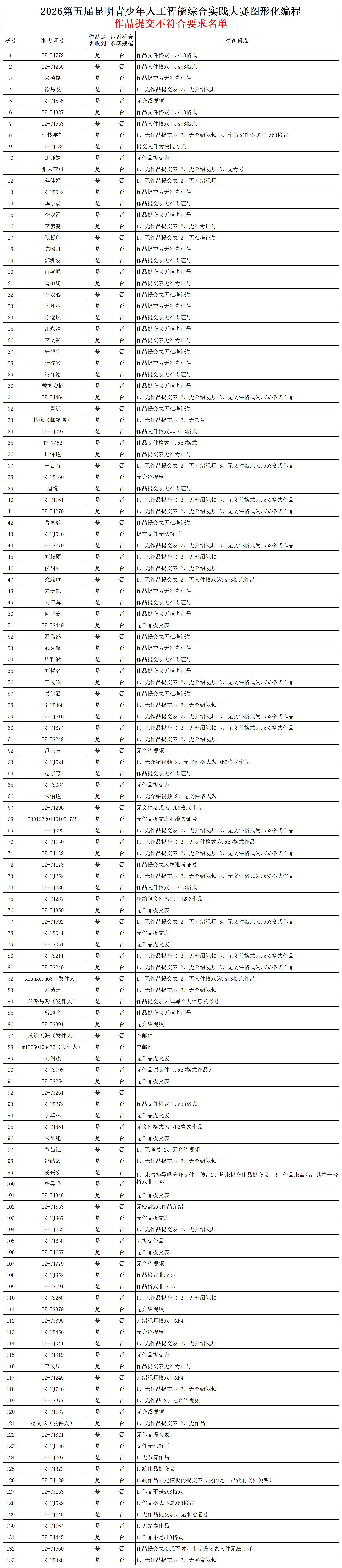 以下选手提交的作品不符合要求(如格式错误、无法打开、内容不完整等),请尽快修改后重新提交,务必在截止时间前完成。